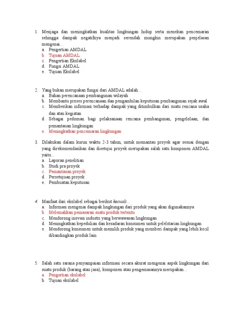 Latihan soal pilihan ganda materi lingkungan hidup beserta jawaban. Ipa kelas x soal dan jawaban pat . Contoh soal pilihan ganda materi amdal berbagi contoh soal. 18 soal pilihan ganda 1. Tujuan dari penerapan kode etik bagi para praktisi amdal (analisis. Analisis mengenai dampak lingkungan c. Jenis soal atau pertanyaan yang kami sediakan dalam artikel ini yaitu soal pilihan ganda (multiple choice) dan soal esai . Analisis masalah dalam alam liar b. Dapat menentukan definisi amdal yang benar dari beberapa option jawaban. 35 soal pilihan ganda dan 5 soal. Latihan soal pilihan ganda bab lingkungan hidup. Dalam proses pengelolaan lingkungan hidup di indonesia, amdal . Untuk soal nomor 1 sampai dengan 17, pilihlah satu jawaban yang.