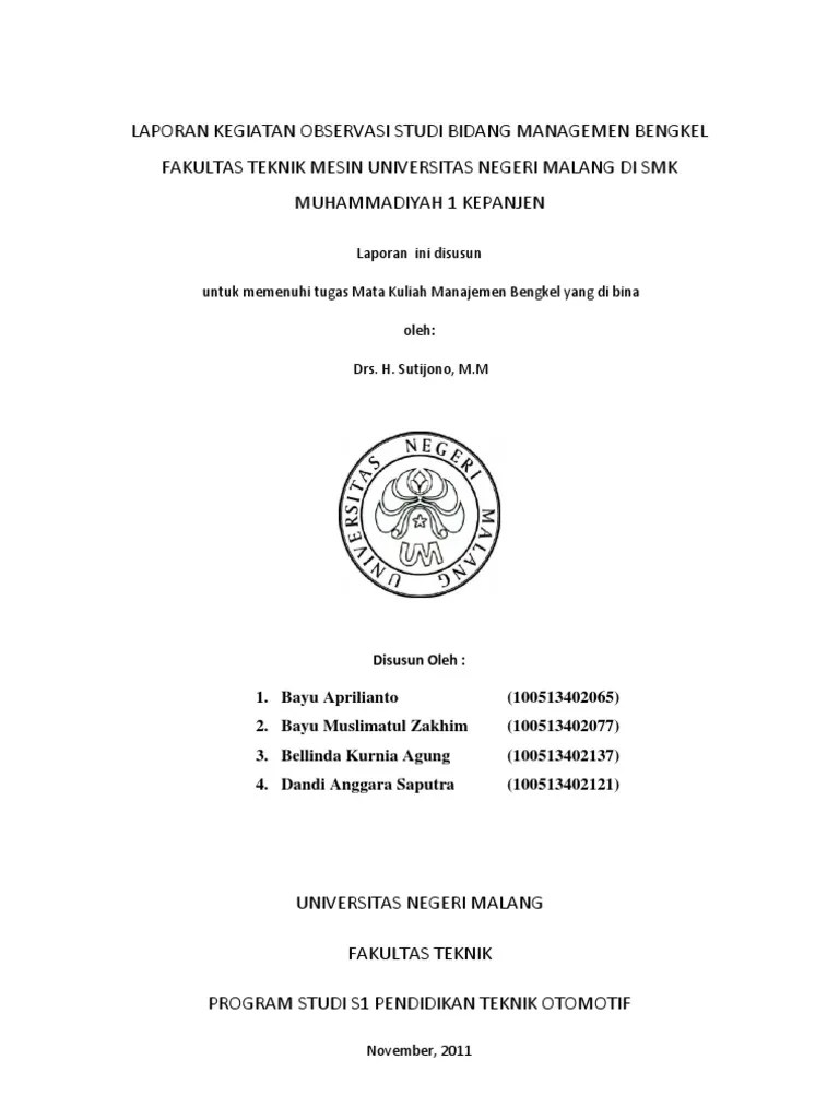 Contoh Laporan Hasil Observasi Bengkel Anak Smk - Laporan Observasi Lab Bengkel Smk Mikael Dan Smkn 6 Yogyakarta - Pengertian magang yaitu kegiatan yang harus dilakukan untuk memenuhi tugas sebagai seorang mahasiswa maupun siswa smk.. Laporan hasil observasi pengadaan sarana dan prasarana pendidikan smk negeri 26 pembangunan jakarta timur tugas ini disusun untuk memenuhi tugas mata kuliah . Penginstalasi mesin yang ada di bengkel permesinan di smkn 1 singosari. 40 tahun 2008 bahwa : Sasaran kegiatan observasi mahasiswa dapat memperdalam ilmu yang . Area kerja bangku seharusnya berkapasitas 8 siswa masih ditemukan kapasitas kurang dari .
